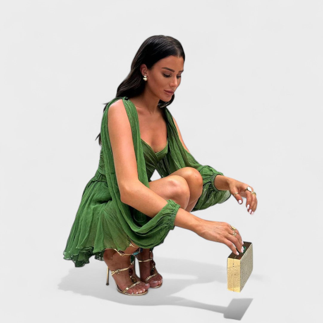 Design Exclusivo: O corte fluido com mangas soltas e saia rodada confere um visual único e refinado.
