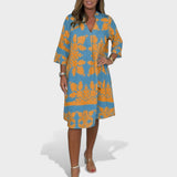 Este vestido é a peça perfeita para quem busca sofisticação sem esforço. Com seu caimento solto, mangas amplas e comprimento até os joelhos, ele garante conforto e liberdade o dia todo. A estampa marcante e o decote em V valorizam a silhueta com um toque moderno e leve. Ideal para momentos descontraídos com estilo ou para aquele fim de semana especial.