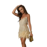 Este deslumbrante vestido de cocktail combina a elegância dos anos 20 com um toque contemporâneo. Com franjas brilhantes e detalhes em penas na barra, é a peça perfeita para fazer uma entrada inesquecível em qualquer evento. O design com alças finas e decote em V valoriza a silhueta, garantindo um visual sofisticado, sensual e cheio de movimento.